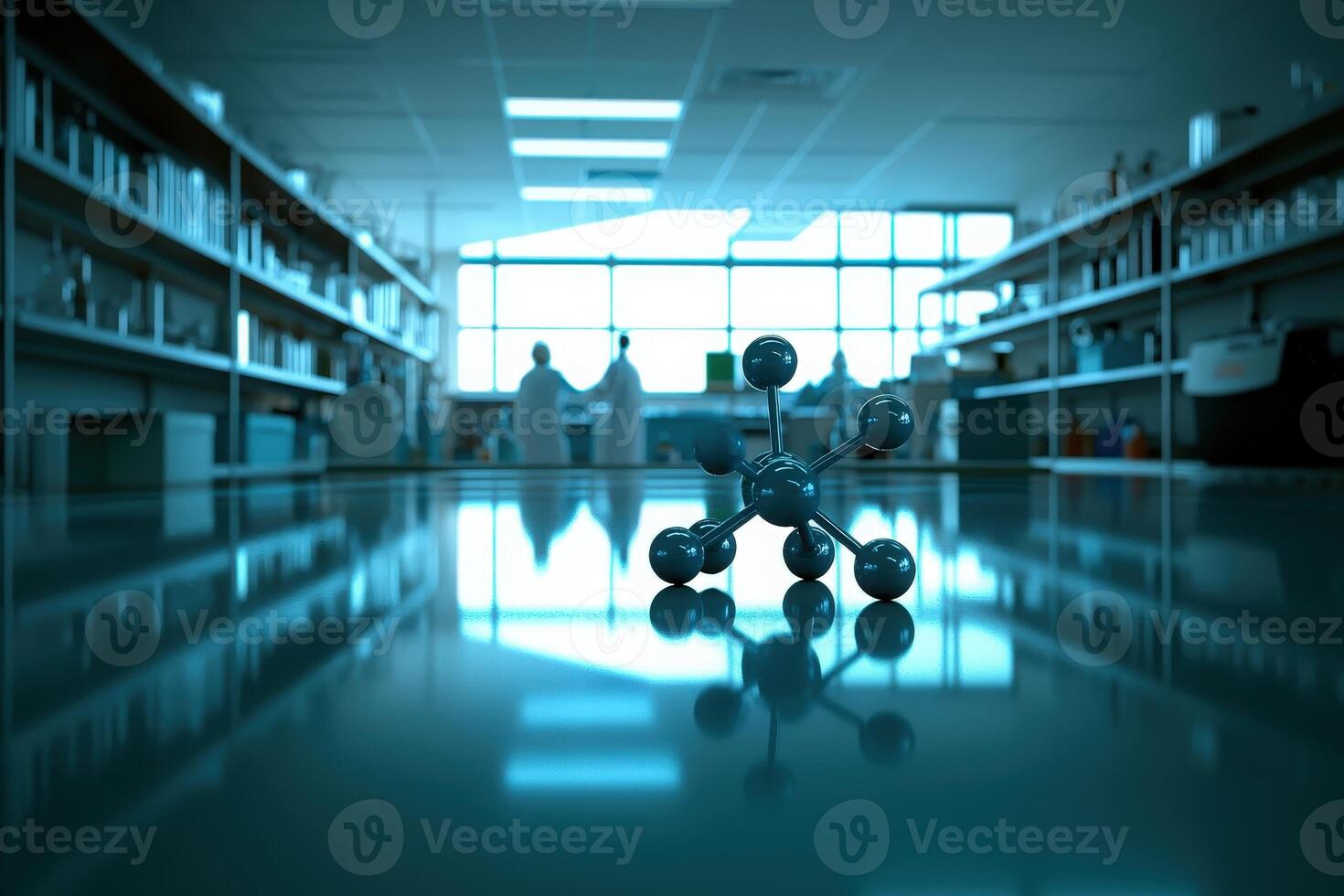 A molecule model stands prominently in the foreground of a laboratory filled with equipment. Two researchers in lab coats are visible in the background, engaged in discussion by large windows. Pro Photo