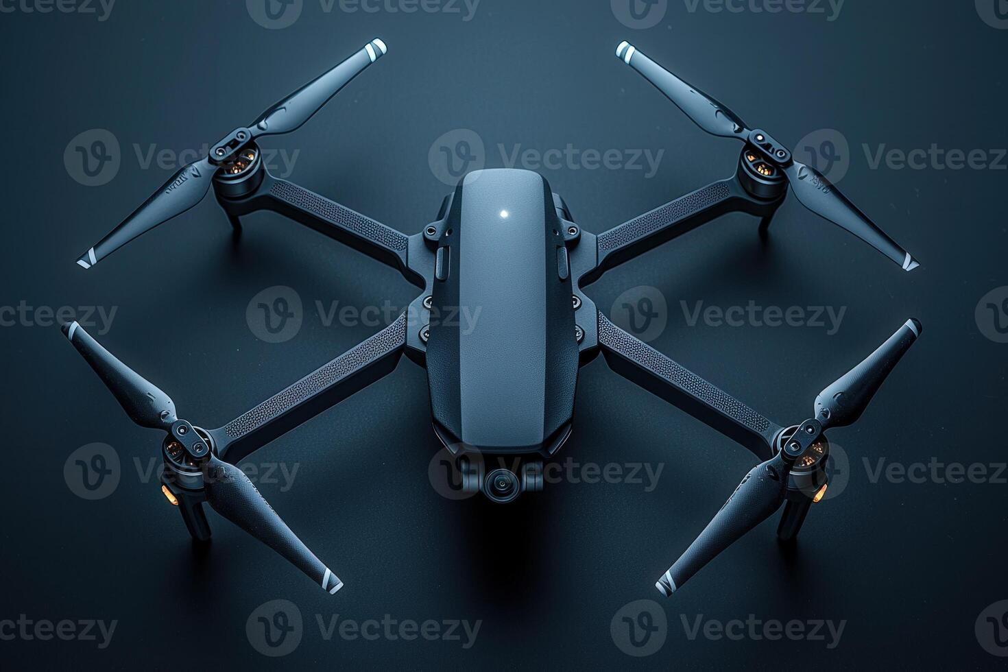 A sleek black drone designed with four propellers is positioned on a dark surface. It showcases advanced technology with its modern design and features, perfect for aerial photography and exploration. Pro Photo