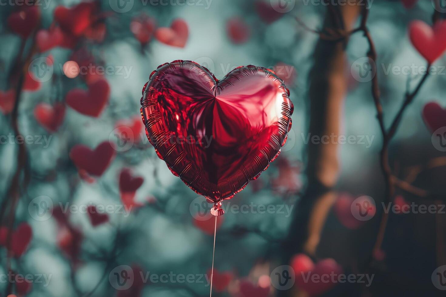A shiny red heart-shaped balloon hangs gracefully from a thin string, surrounded by blurred tree branches decorated with smaller red heart shapes, creating a romantic atmosphere. Pro Photo