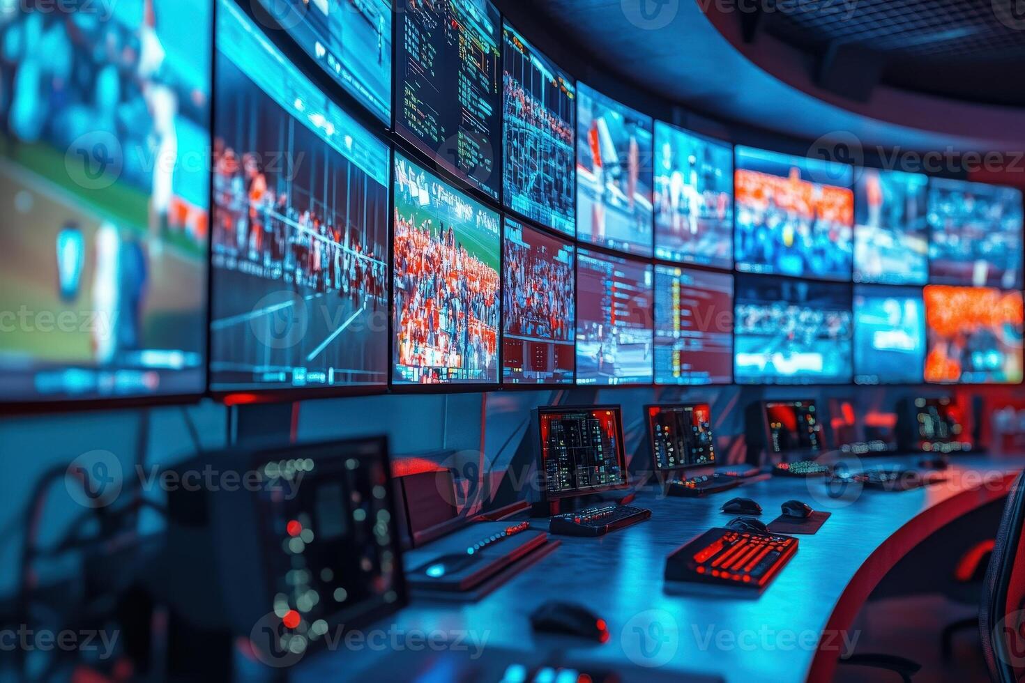 A modern control room equipped with numerous high-resolution screens showing various live sports events and data. Analysts monitor the action while using advanced technology and equipment. Pro Photo