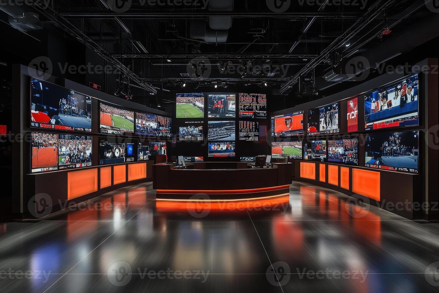 A vibrant broadcast studio features numerous large screens displaying various live sports events. The design is sleek, with soft lighting and high-tech equipment creating an engaging atmosphere. Pro Photo