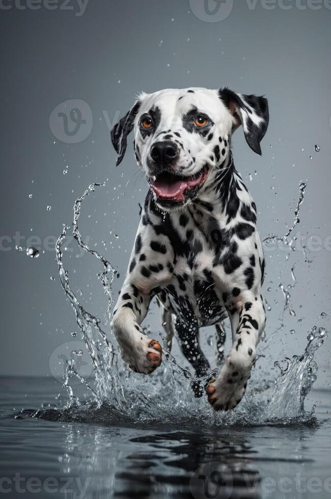 A Dalmatian dog joyfully leaps through water, creating splashes in a dynamic action shot. Pro Photo