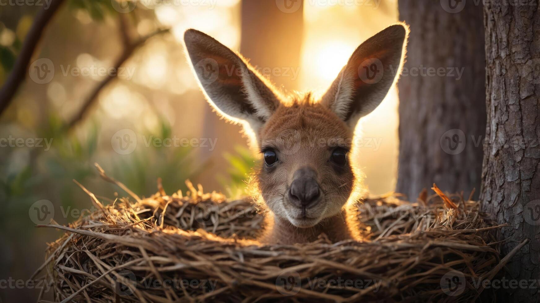 A kangaroo joey peeks out from a nest surrounded by trees and soft sunlight. Pro Photo