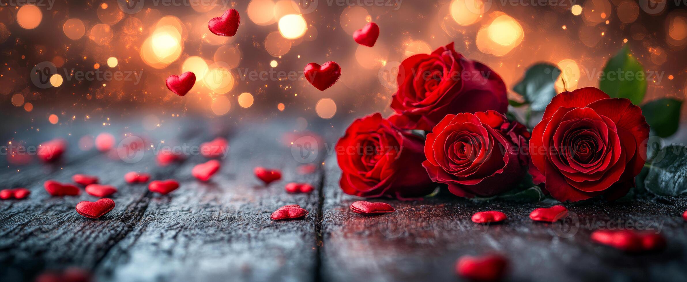 A bouquet of red roses is on a wooden table with a heart-shaped pattern. The roses are scattered around the table, with some of them placed in the center and others surrounding them Pro Photo