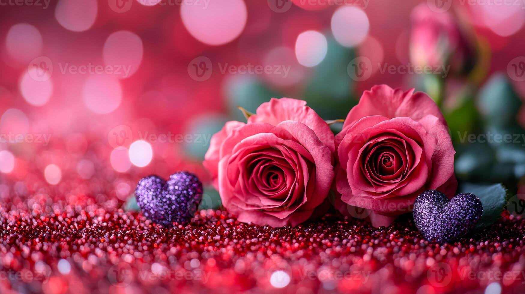 A pair of red roses are placed on a red background with glitter. The roses are surrounded by hearts, which adds a romantic touch to the scene. The glitter and the red color scheme create a warm Pro Photo