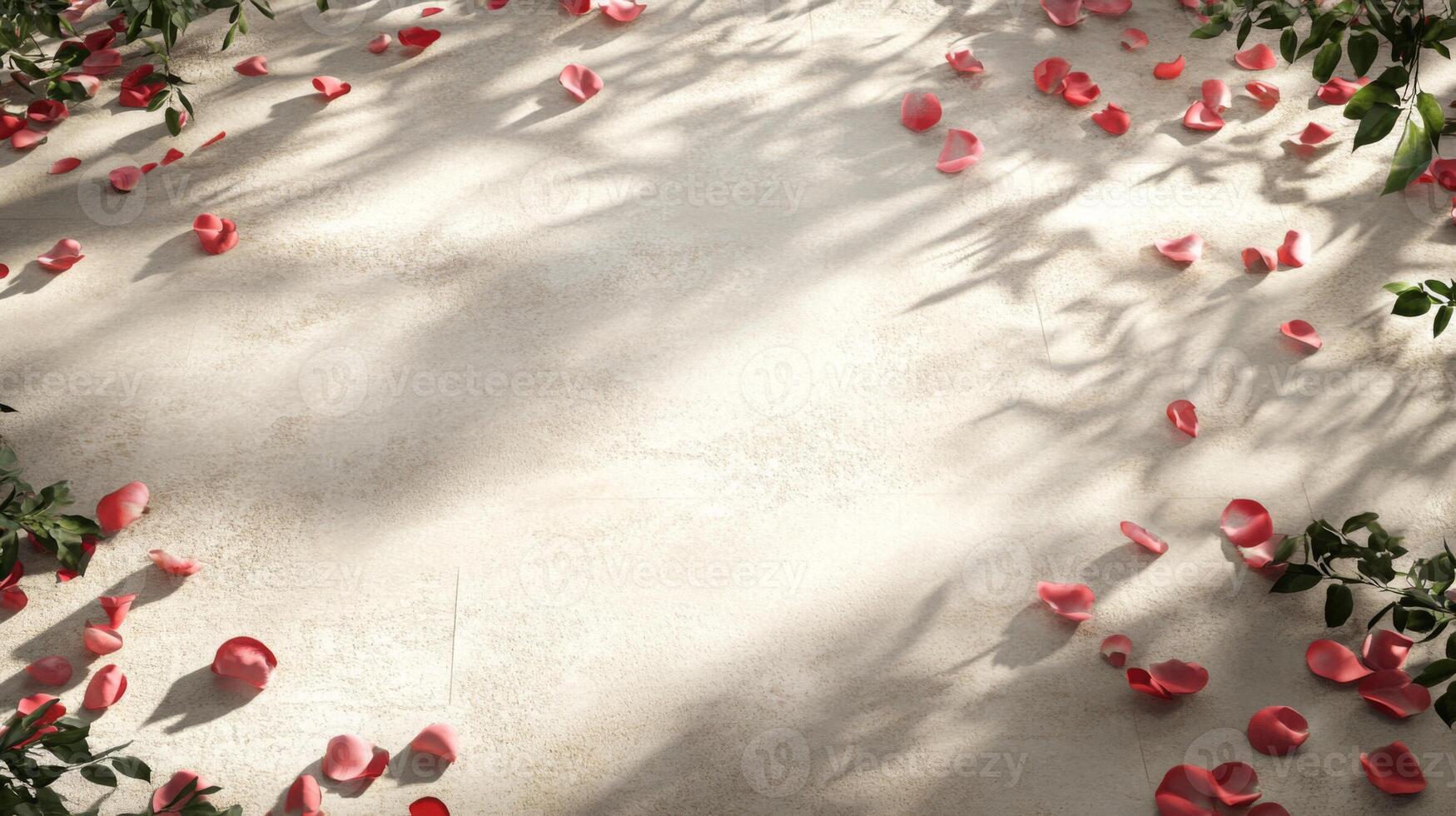 Rose petals in soft shades of pink scatter across a light, textured surface, creating a romantic atmosphere. Green leaves frame the petals, adding a natural touch to the serene setting. Pro Photo