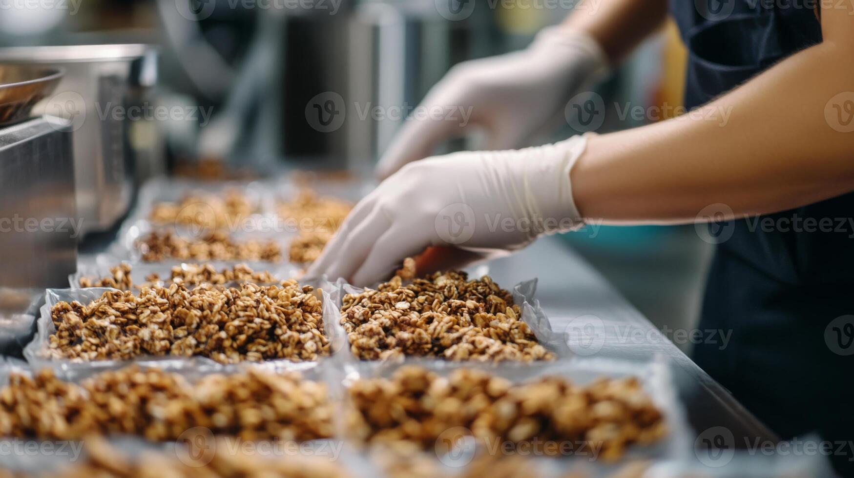 Workers efficiently package granola in trays at a food production line. This process utilizes automation and precision technology to ensure quality and consistency in every batch crafted. Pro Photo