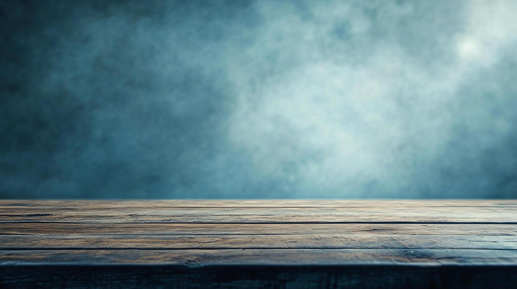 Wooden table with a blue background. The table is empty. The background is blurry and has a hazy look to it photo