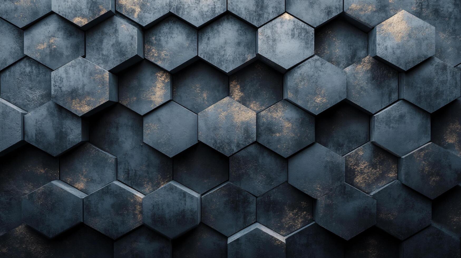 Wall of hexagonal tiles with a metallic sheen. The tiles are arranged in a pattern that creates a sense of depth and texture. Scene is one of modernity and sophistication photo