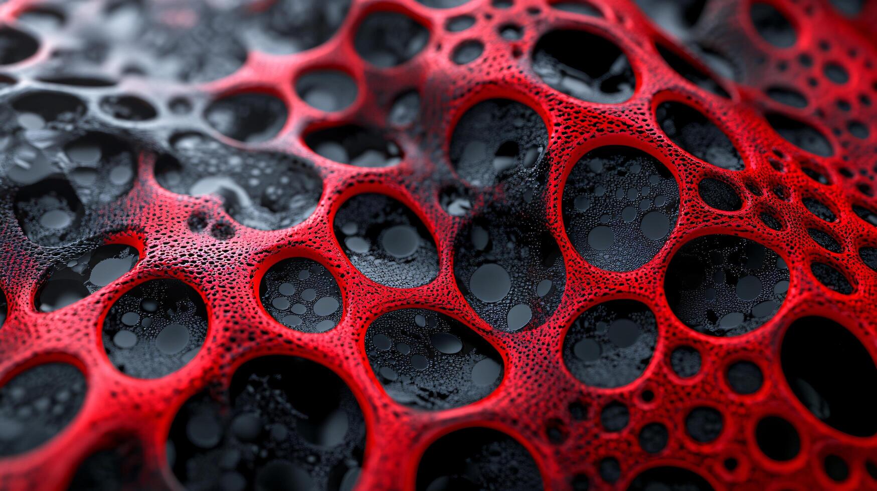 Red and black abstract image with many holes and dots. The image has a futuristic and surreal feel to it photo
