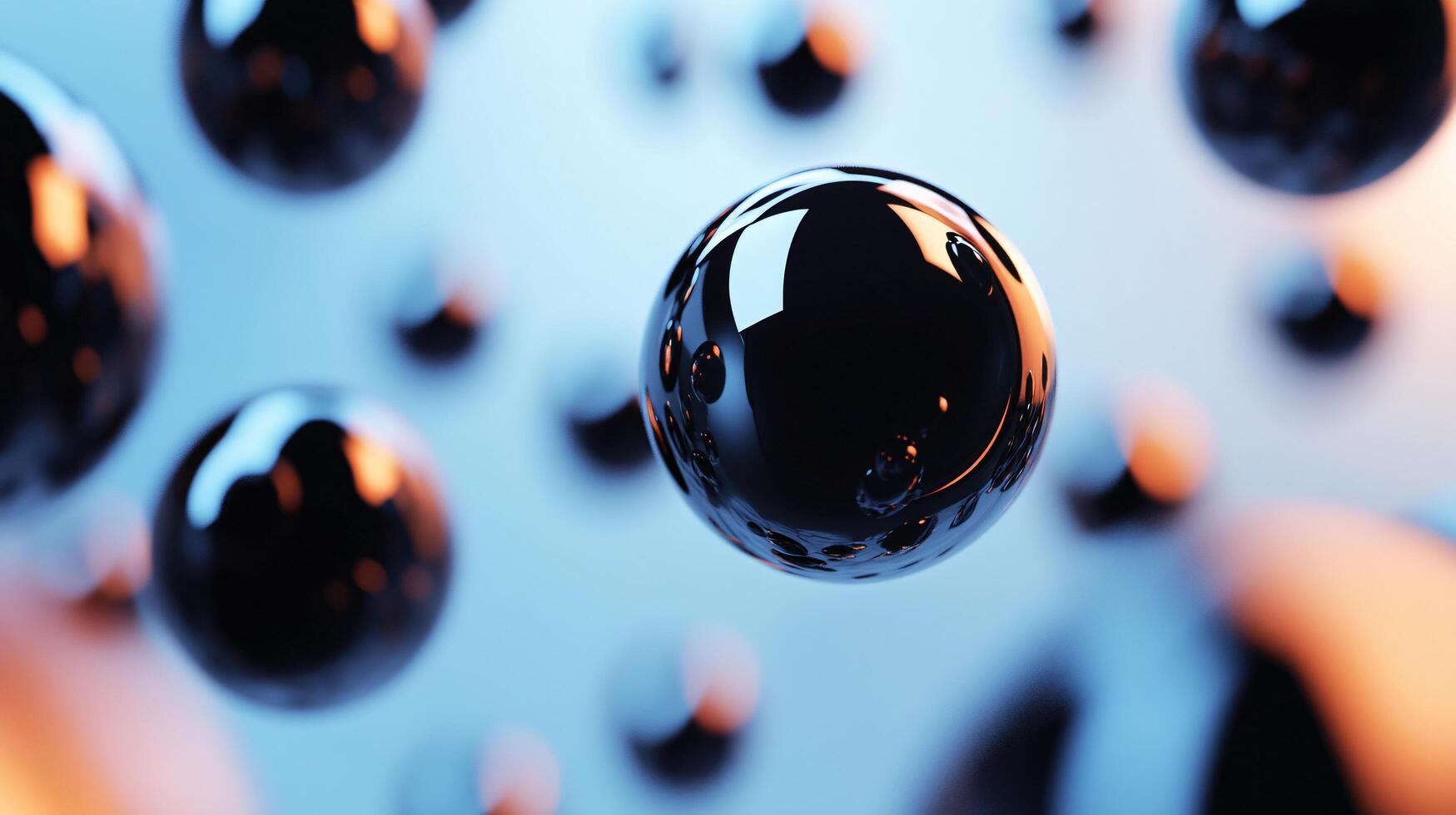 Close up of many shiny, metallic spheres. The spheres are all different sizes and are scattered throughout the image. Scene is one of chaos and disorder, as the spheres seem to be randomly placed photo
