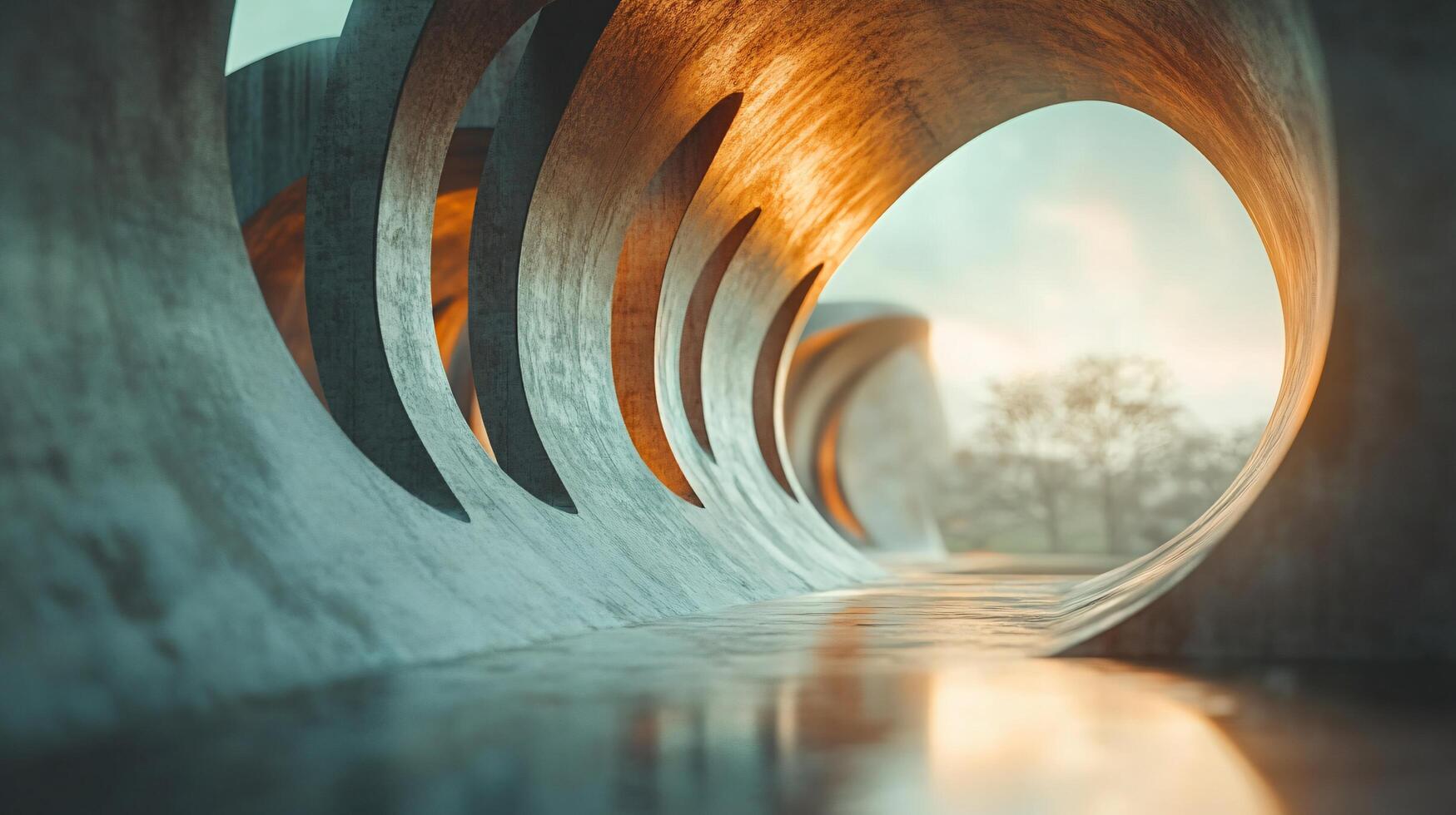 Tunnel with a tree in the background. The tunnel is made of concrete and has a curved shape. The light is shining through the tunnel, creating a warm and inviting atmosphere Free Photo