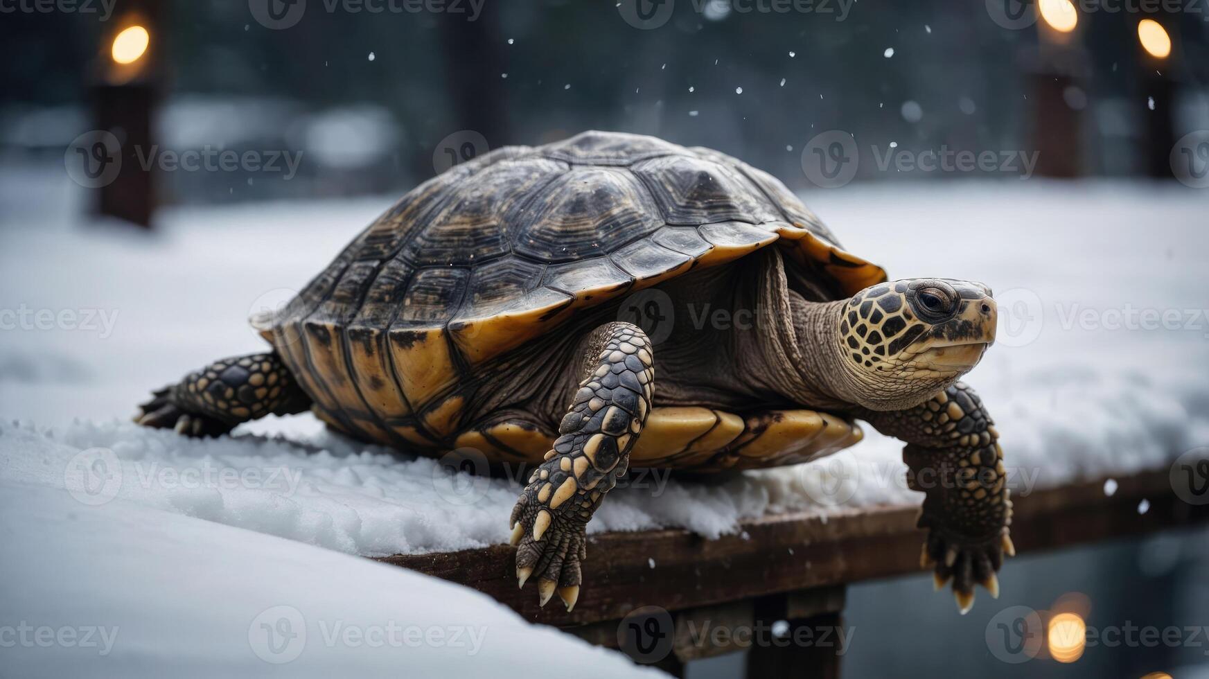 A tortoise resting on a snowy surface, showcasing its unique shell patterns. Pro Photo