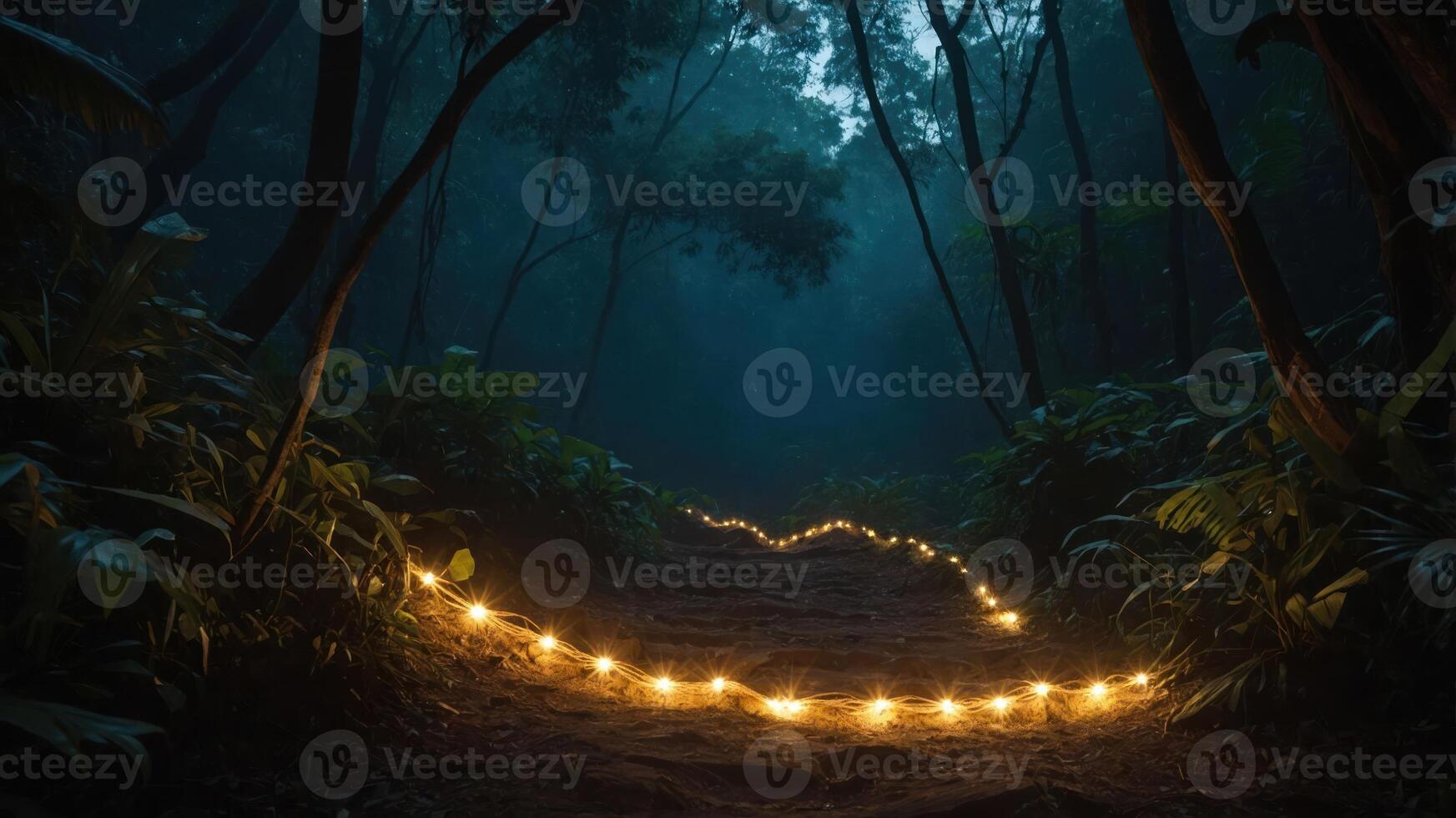 A serene forest path illuminated by string lights, creating a magical atmosphere. Pro Photo