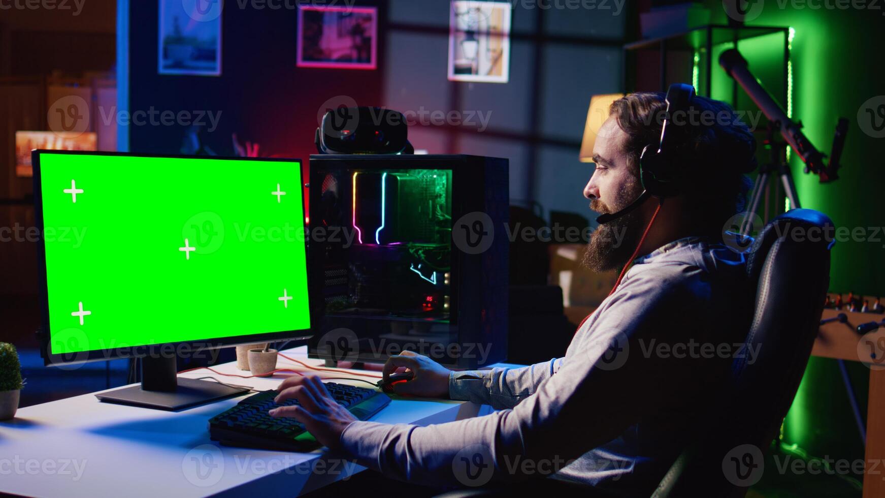 Man in dimly lit apartment playing games on isolated screen gaming PC at computer desk, enjoying day off from work. Gamer battling enemies in online multiplayer shooter on chroma key monitor Pro Photo
