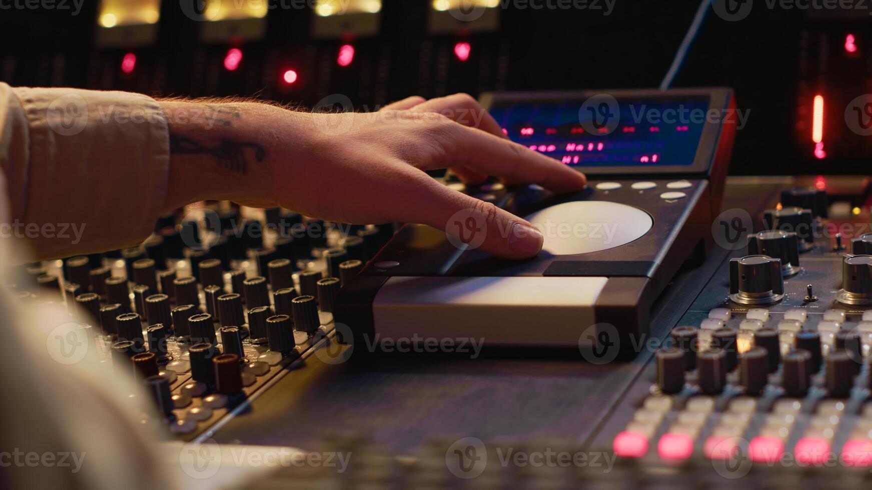 Audio technician uses mixing console and faders in control room, remote control for adjusting sound on mixer. Music producer changes volume level, creates tracks with technical equipment. Camera A. Pro Photo