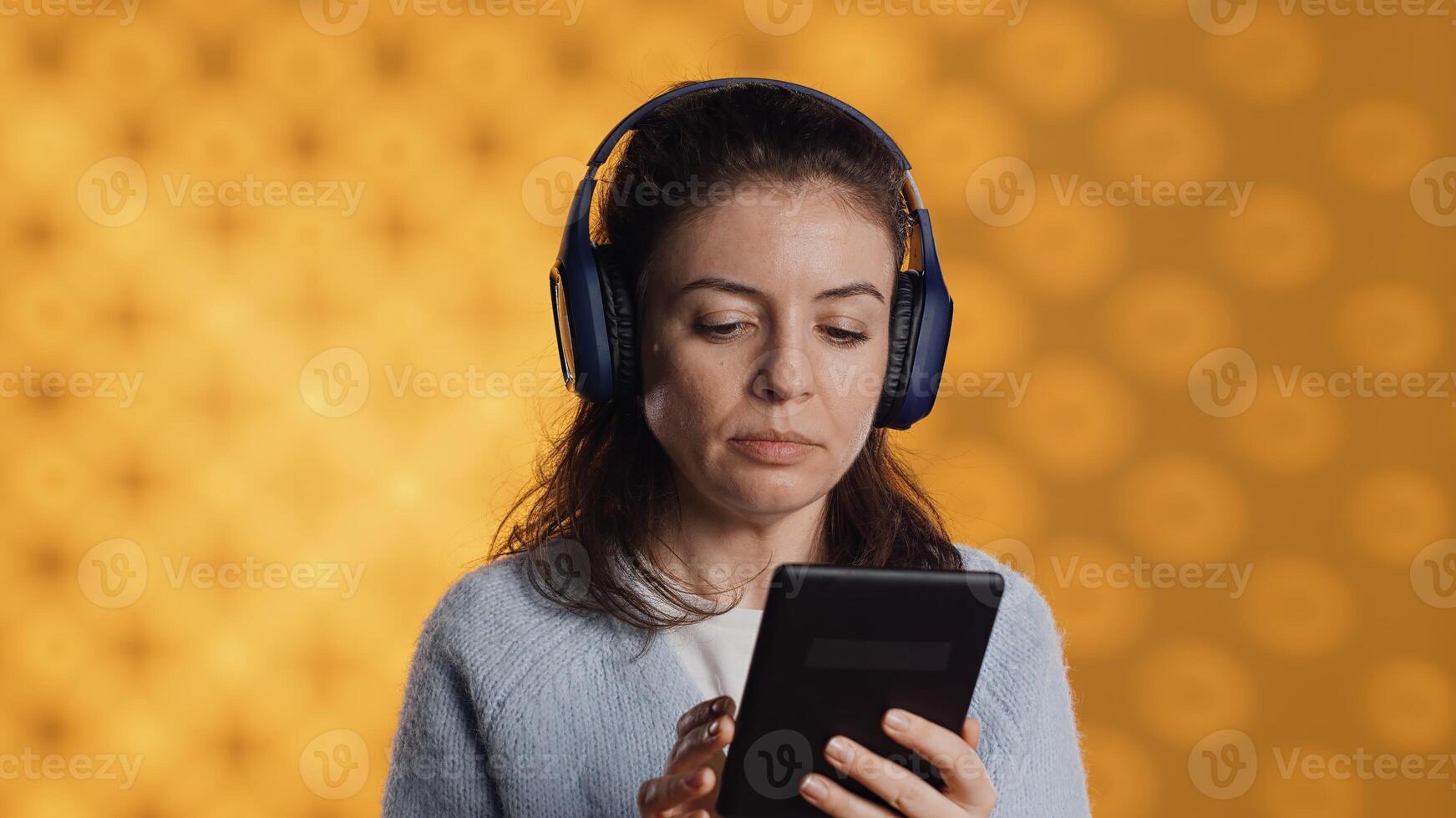 Woman wearing headphones, practicing new language using internet app on digital tablet, isolated over studio background. Person repeating foreign words, reading them on device Pro Photo