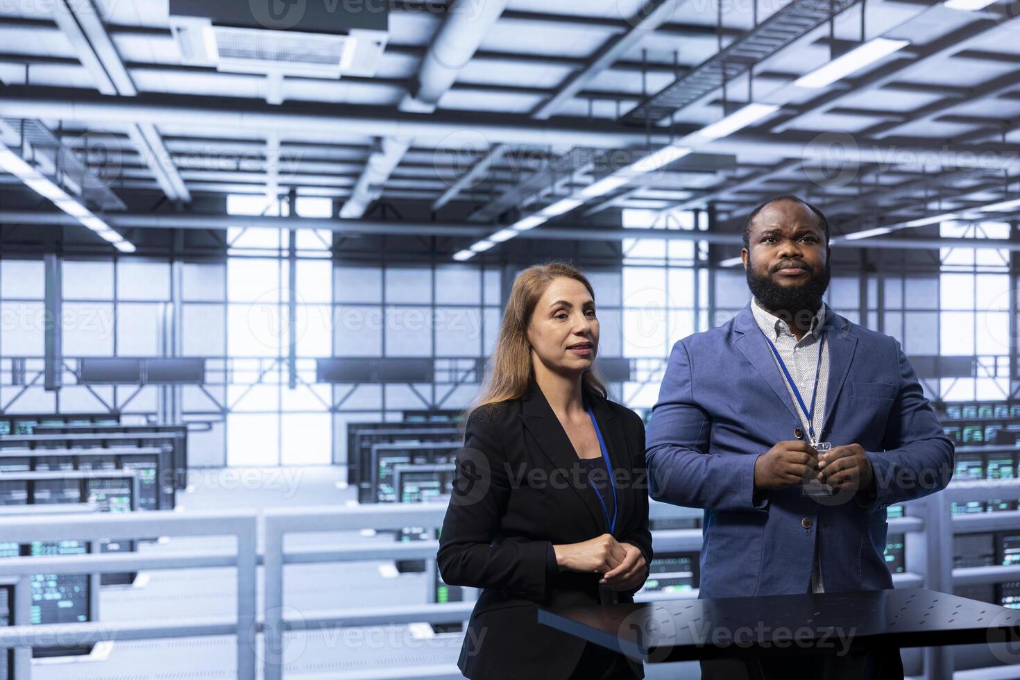 Admins in data center tracking network traffic and activity using augmented reality technology and installing software updates. Coworkers performing database backups using AR tech visualization Pro Photo