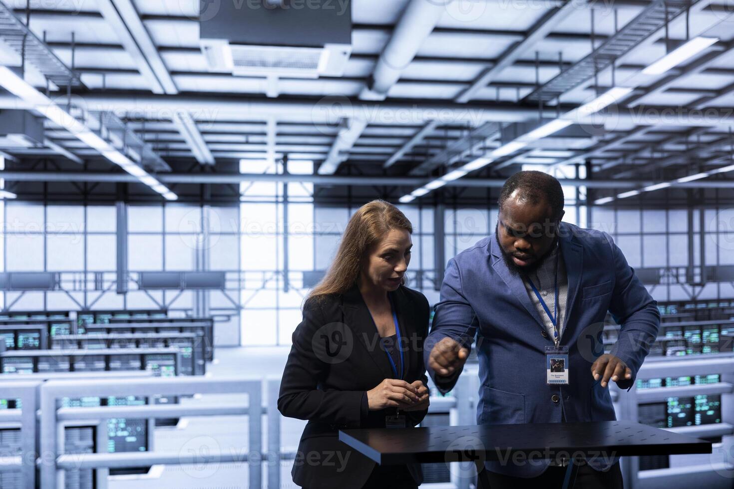 Engineers looking at AR visualization, doing disaster recovery planning in data center. Coworkers using augmented reality in server room to reduce downtime, ensuring business continuity Pro Photo