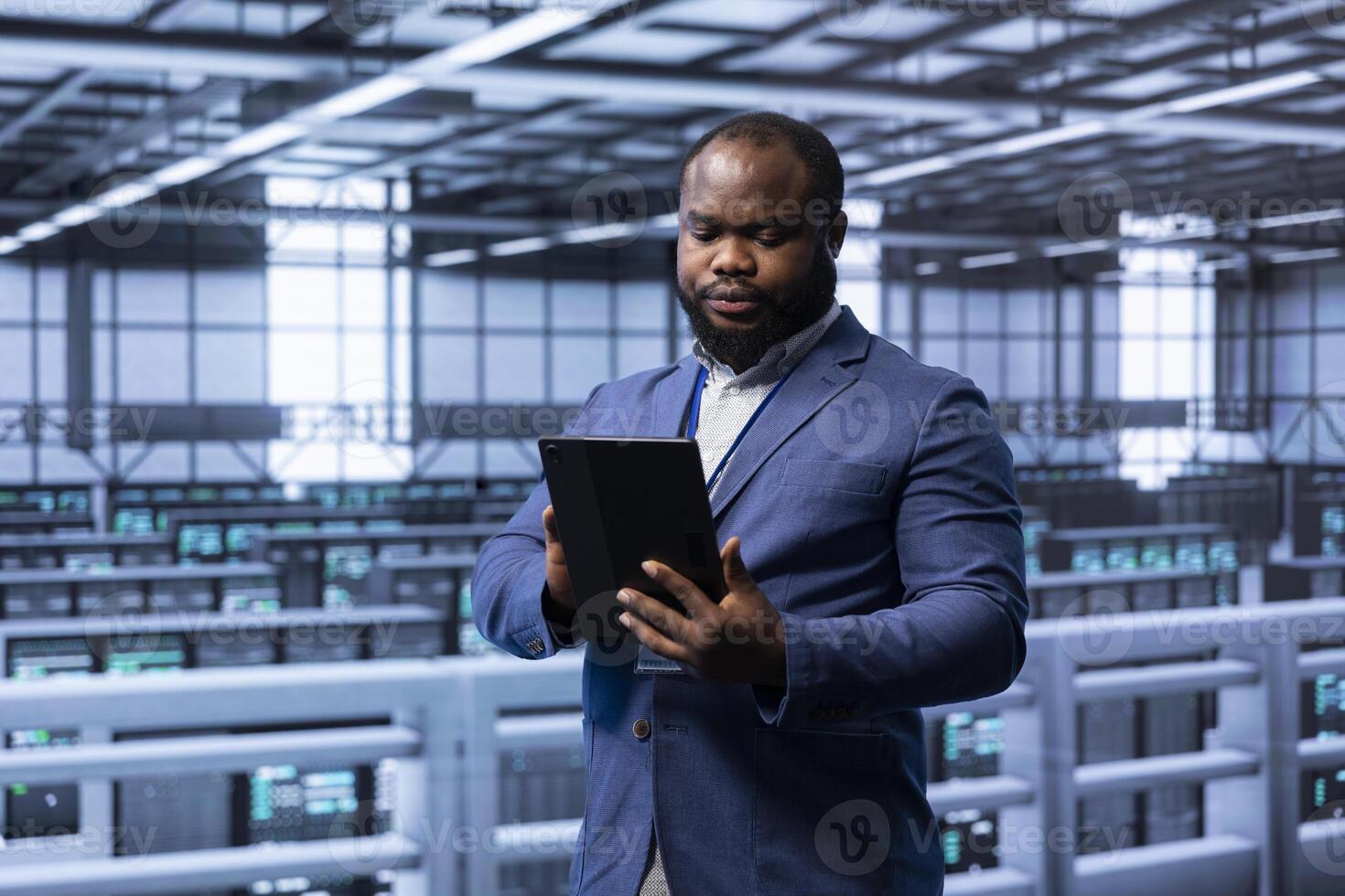 Admin in server room establishment installing newly ordered storage units using device. IT professional working in data center workplace housing storage rackmounts hardware Pro Photo