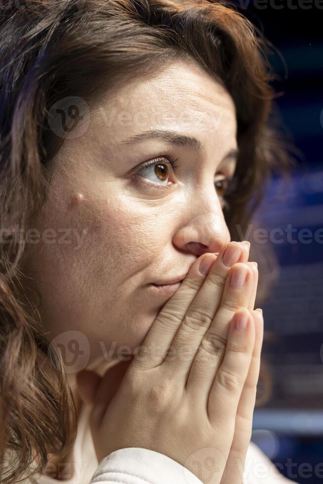 Stressed programmer praying for vulnerabilities in software systems to be fixed after applying patch. Worried woman using PC to eliminate errors, wishing to be successful Pro Photo