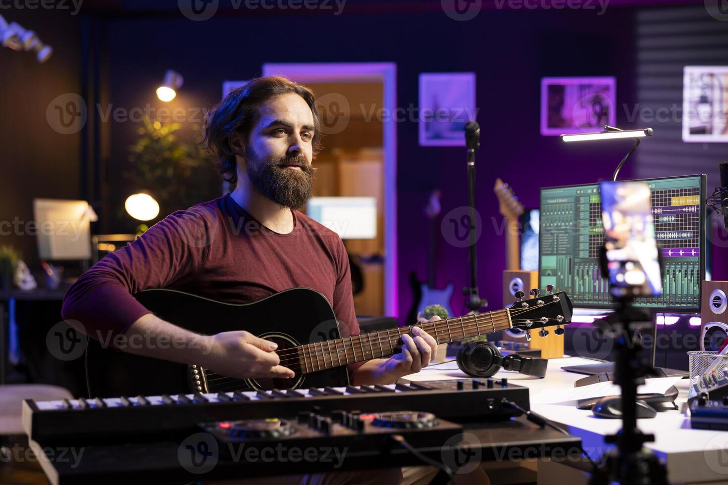Skilled artist teaching how to play acoustic guitar on internet, creating online tutorial to give assistance with musical instrument. Musician performer explaining accords and notes on each strings. Pro Photo