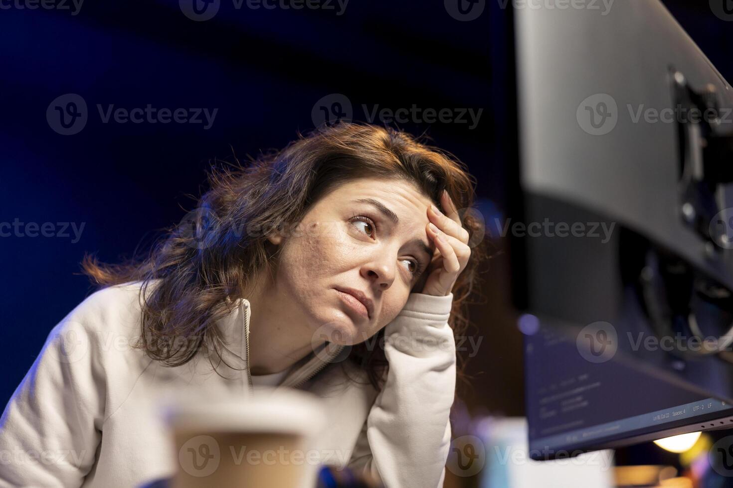 Worried system administrator stressed after finding many security vulnerabilities, scared of malware infections. Anxious IT staff member distressed by cyber attacks on computer systems Pro Photo