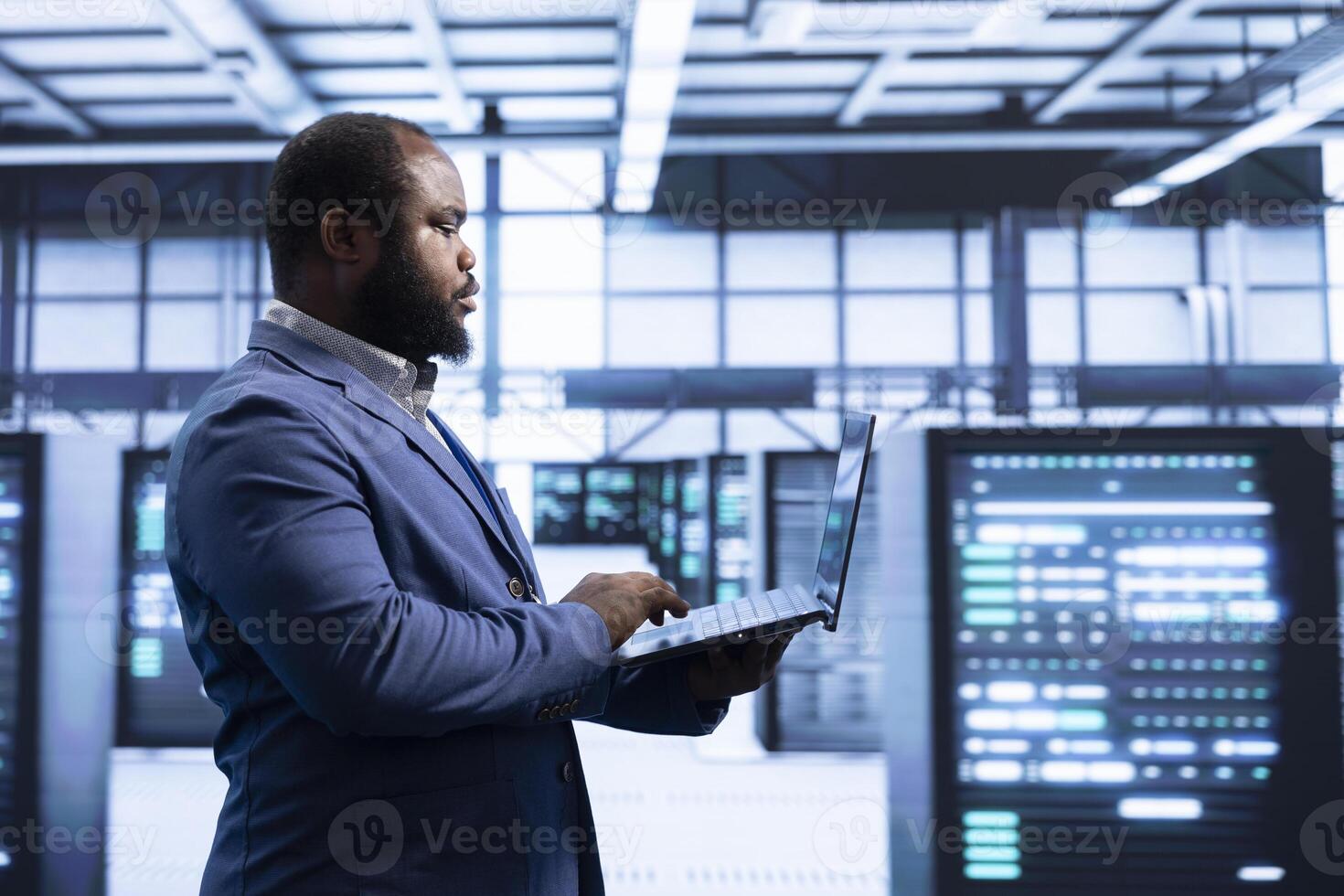 Programmer using laptop in data center with advanced technology, ensuring cybersecurity and efficient network management. Professional in server hub optimizing data center infrastructure with notebook Pro Photo