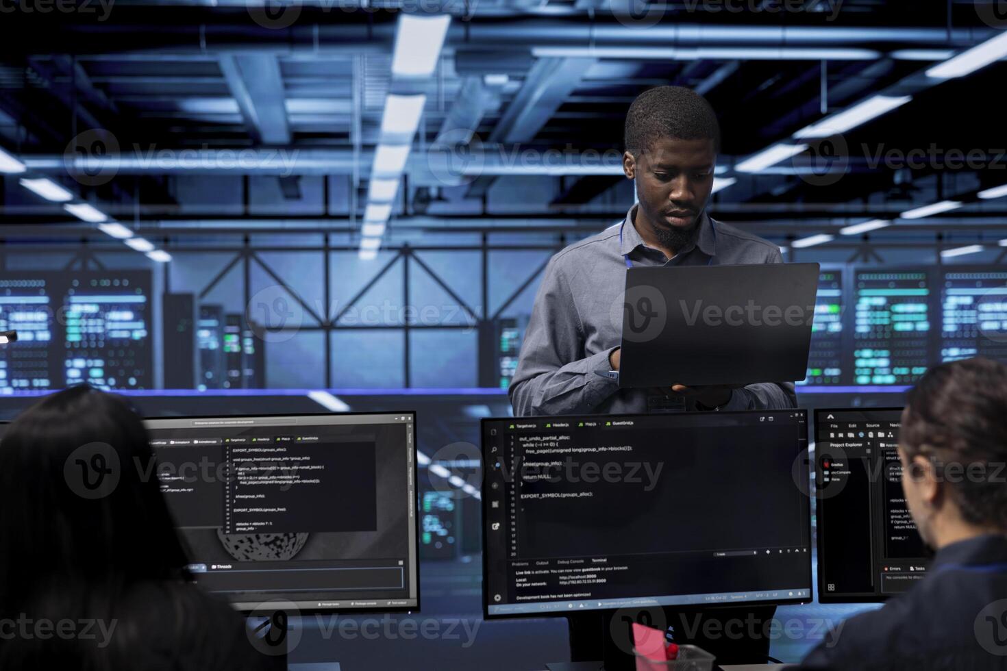 Admin doing routine maintenance in data center to extend equipment life span and avoid downtime. Worker monitoring servers for issues such as overheating or power fluctuations Pro Photo