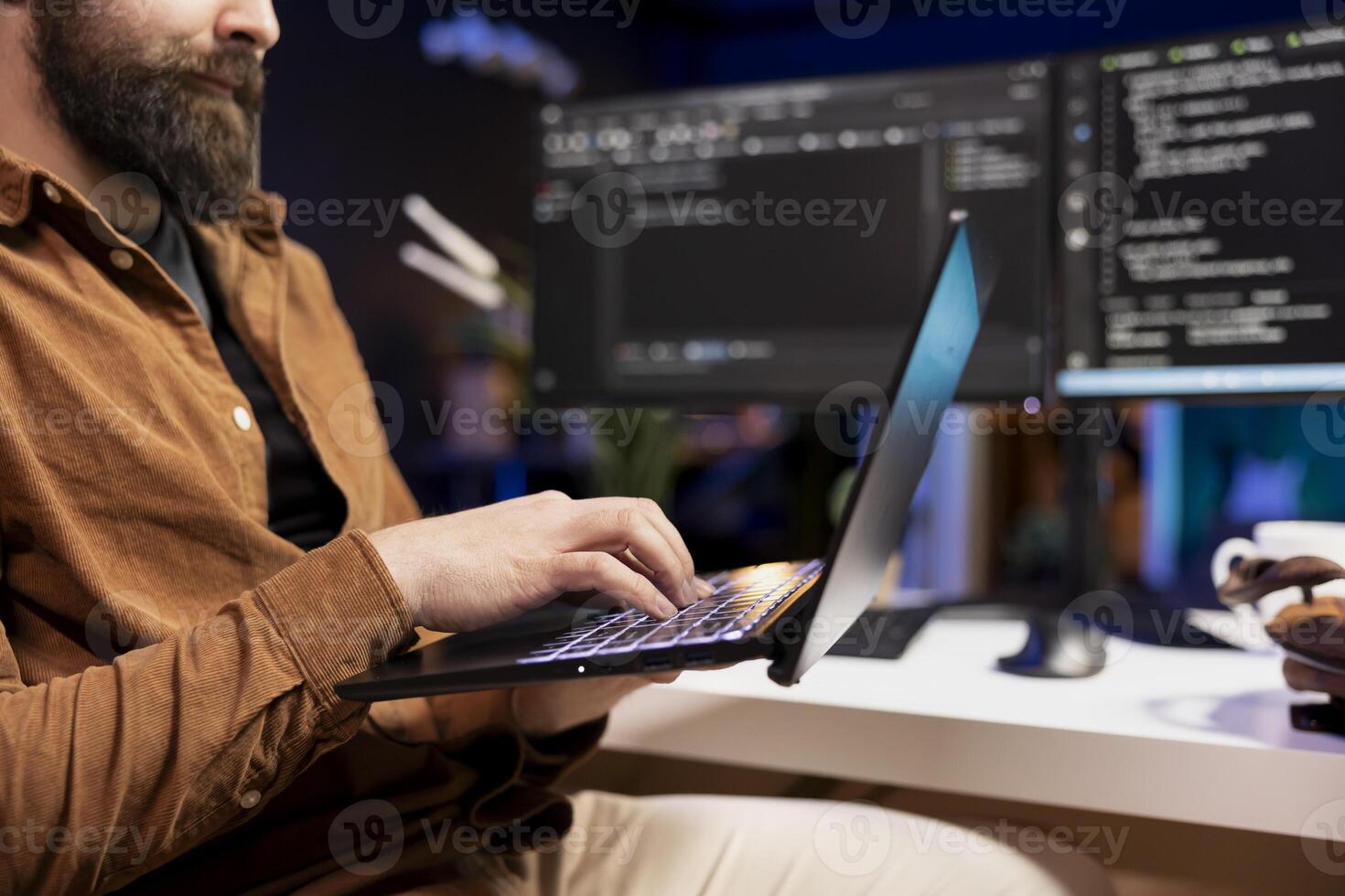 Admin in apartment typing on laptop to fix vulnerabilities in software enabling attackers to compromise systems. Cybersecurity specialist taking care of security exposures, close up Pro Photo