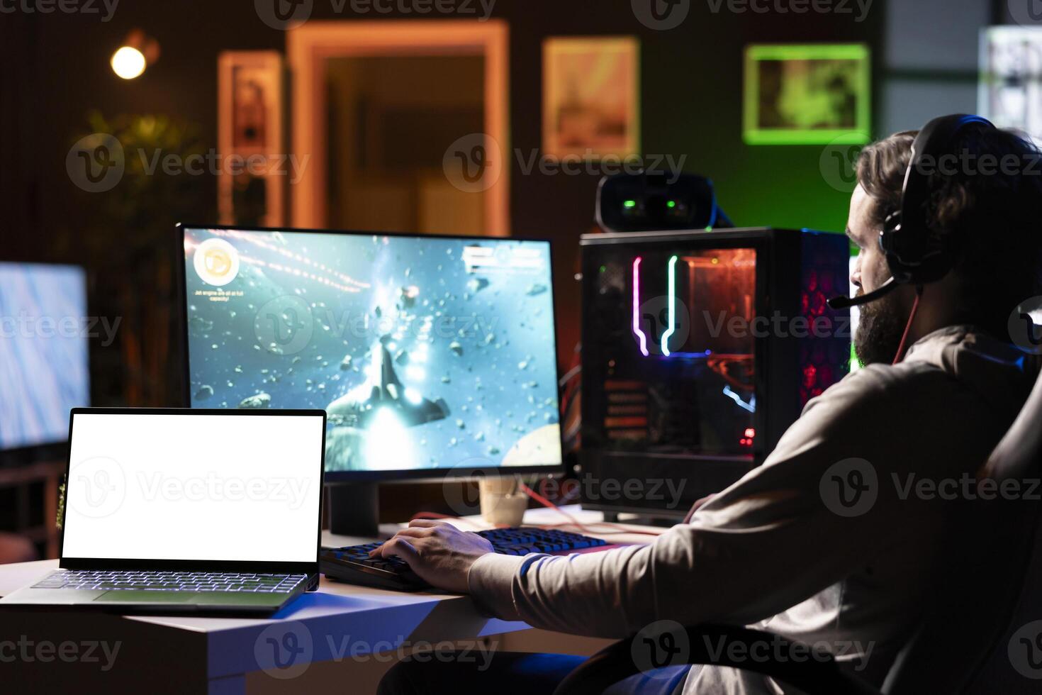 Isolated screen laptop next to man having fun by using gaming keyboard to fly spaceship in SF videogame. Mockup notebook device next to gamer using powerful PC and computer peripherals to play game Pro Photo