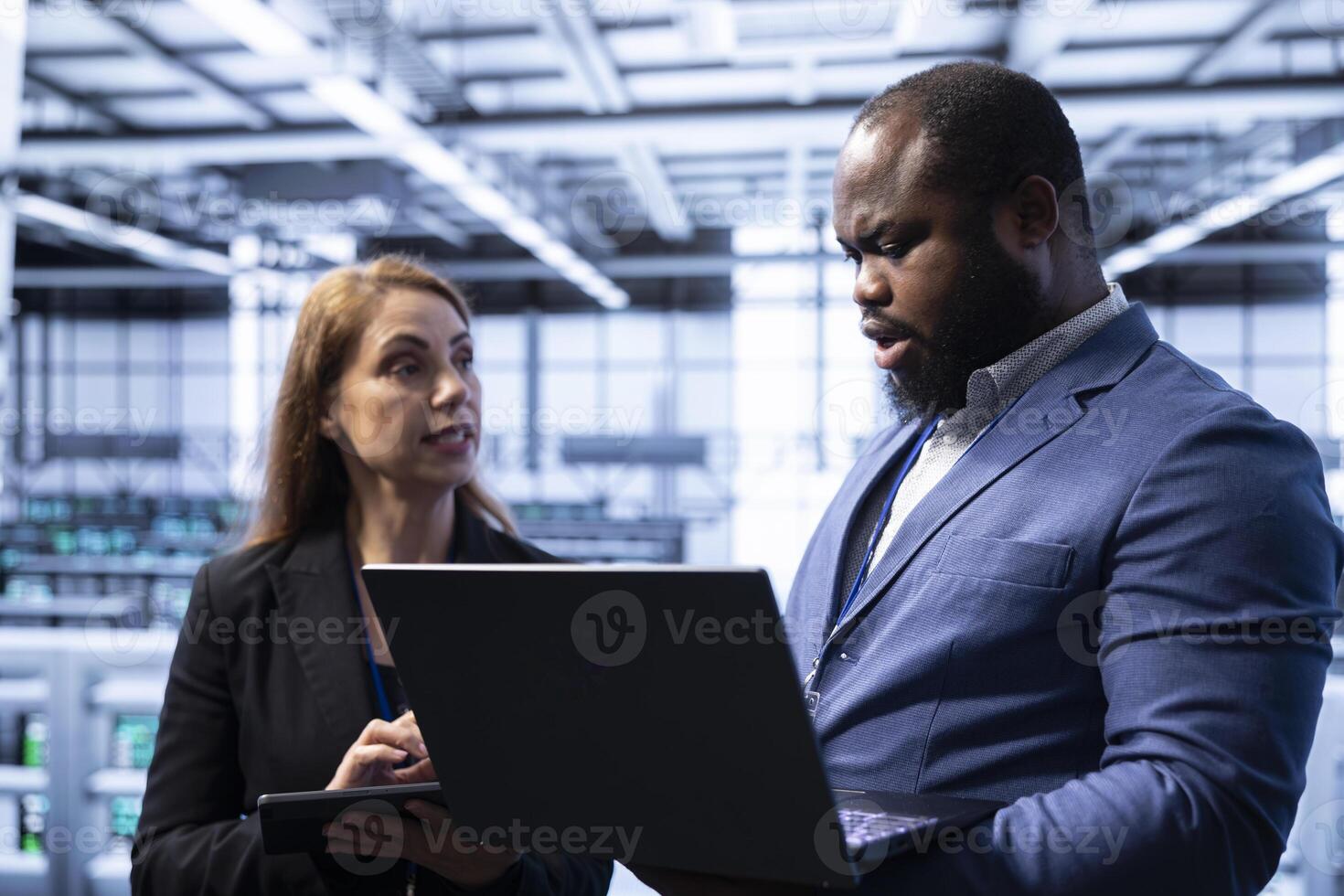Employee in server hub showing manager recovery plan on laptop, monitoring energy consumption. Coworkers doing brainstorming in data center, making sure rigs are functioning optimally Pro Photo