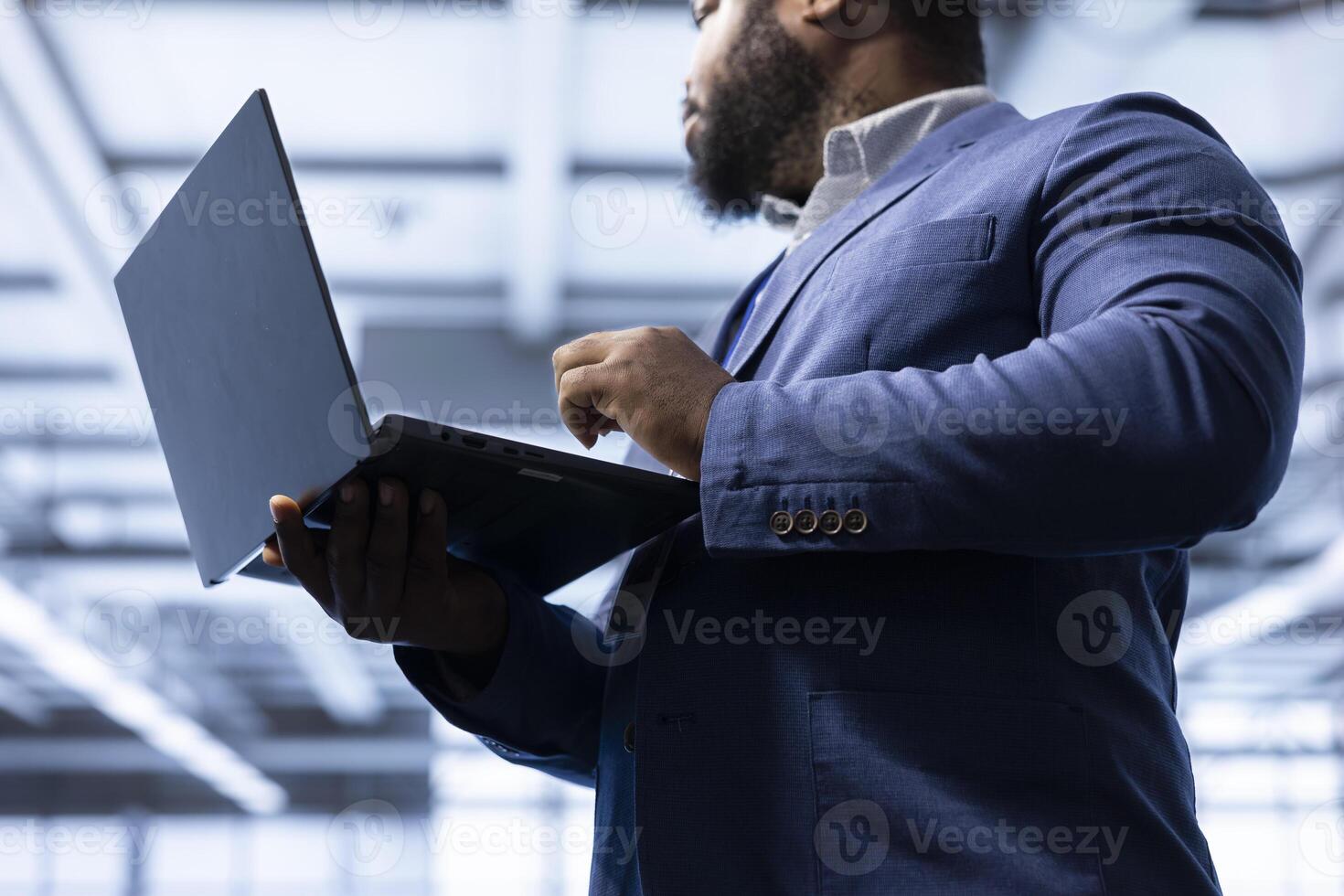 Software developer using laptop in data center to do disaster recovery planning and security enforcement. Close up of expert in server room working to reduce equipment downtime Pro Photo