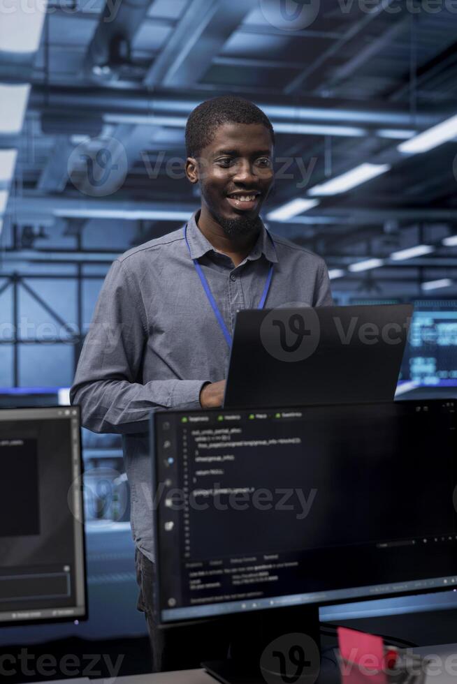 Smiling engineer pleased by recovery plan, monitoring data center energy consumption. Happy african american employee in server room making sure sensors are functioning optimally, doing disk checks Pro Photo