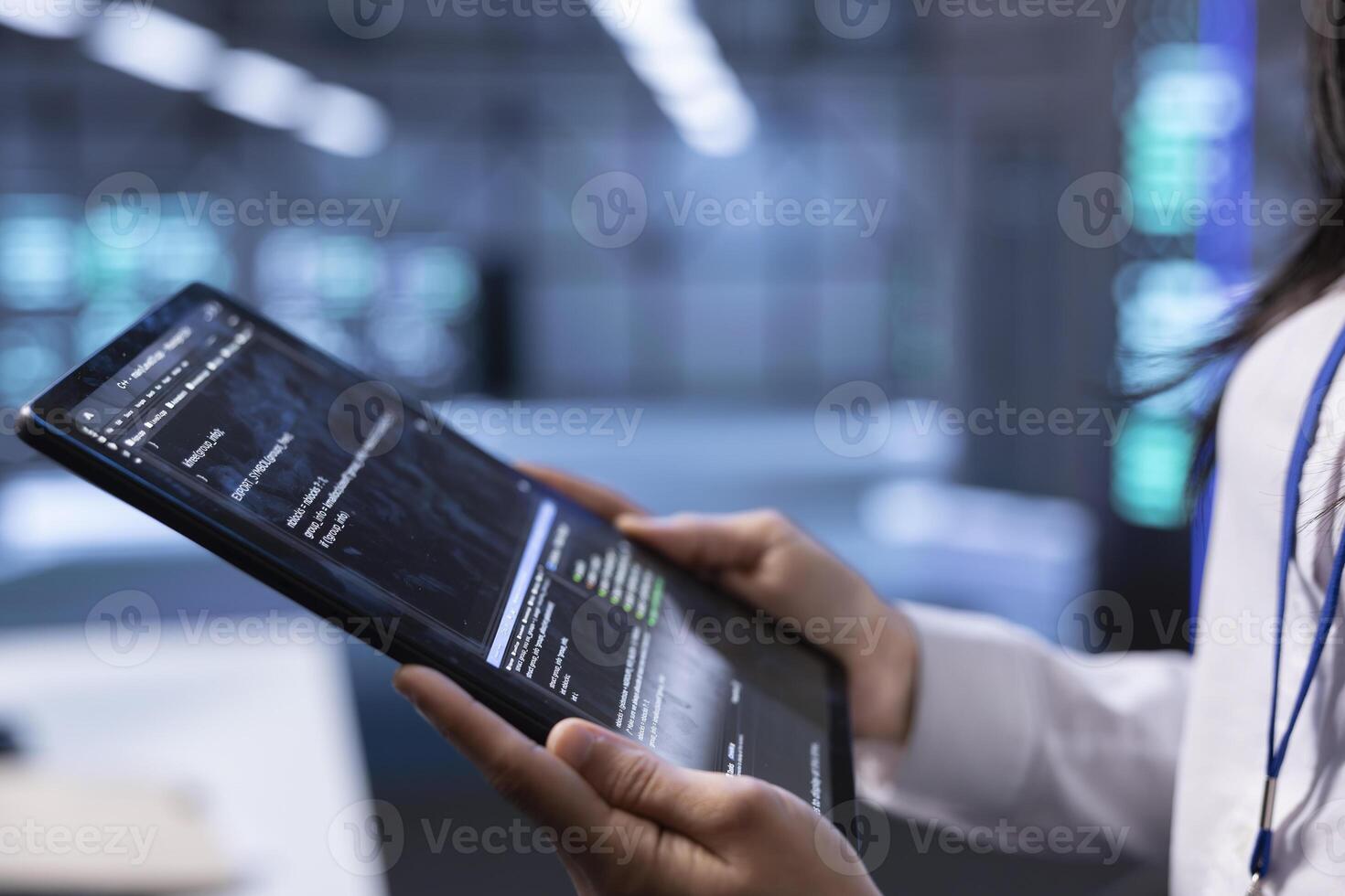Close up of device used by engineer to troubleshoot hardware and software errors in server farm. Employee maintaining supercomputers network infrastructure in data center with tablet Pro Photo