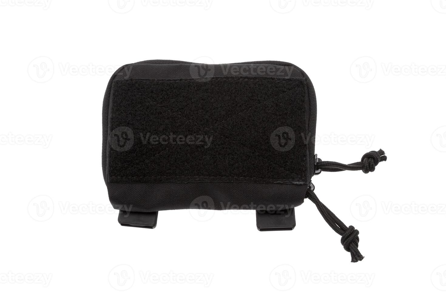 A black zippered case with a Velcro patch on the front, featuring two loops at the bottom and drawstrings on the side, isolated on a white back Pro Photo