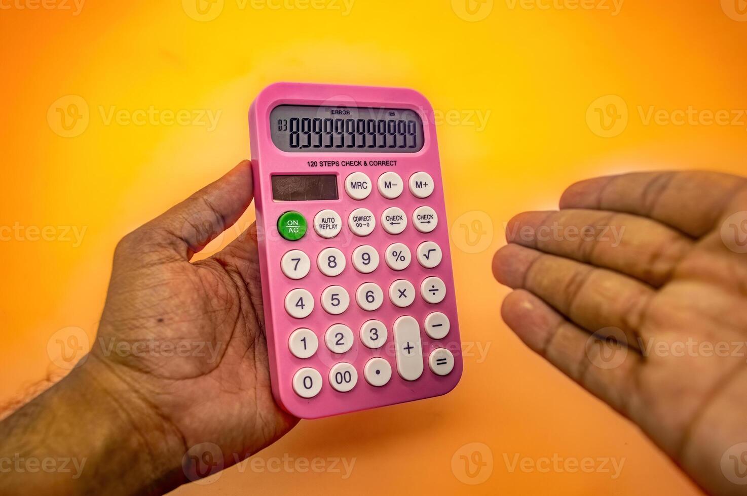 A person hand holding a pink calculator against a yellow background. The calculator displays a series of zeros and has various function buttons, making it ideal for educational or office settings Pro Photo