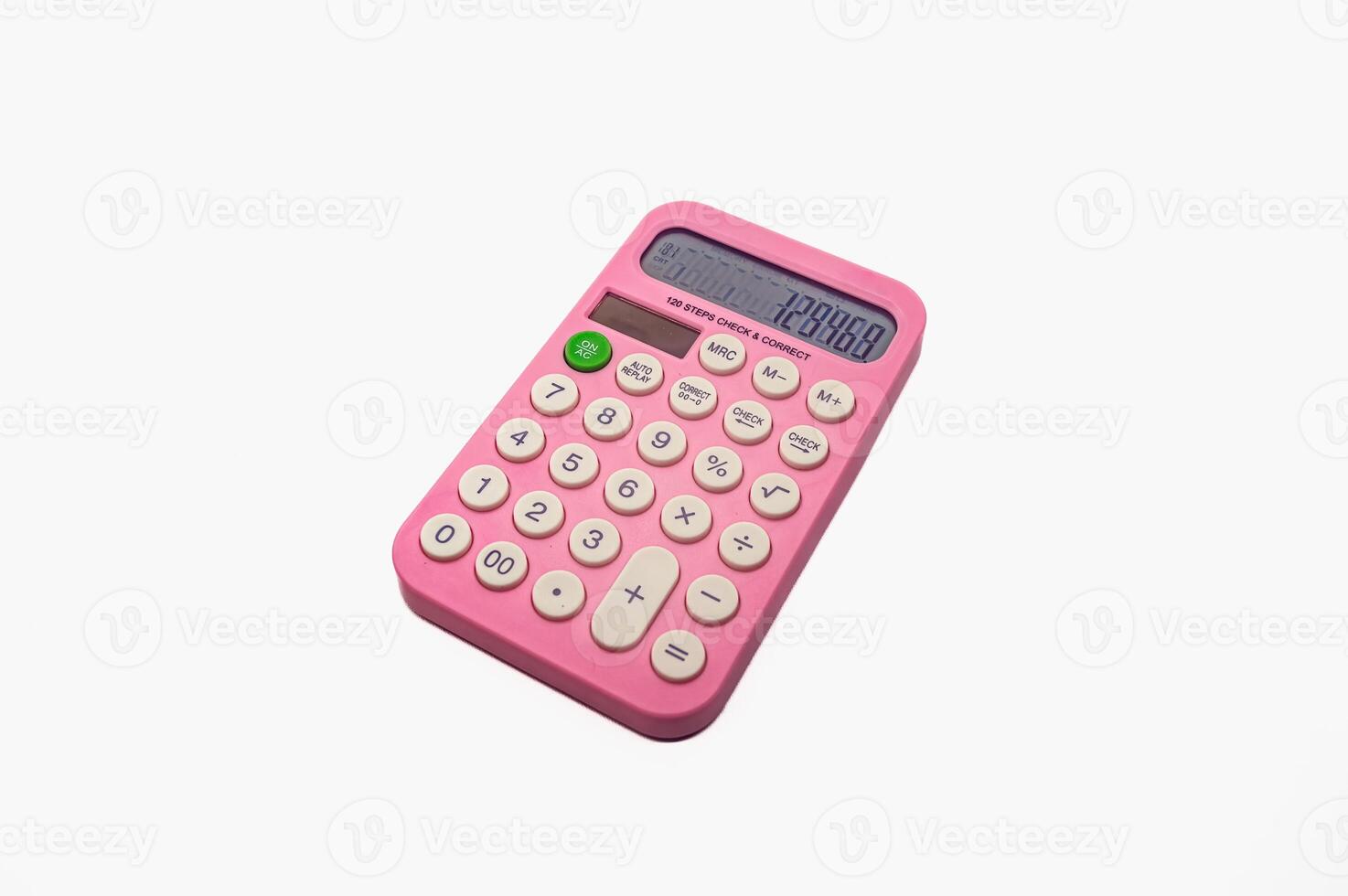 A pink calculator with white buttons. It features basic arithmetic functions and additional memory and correction keys Pro Photo