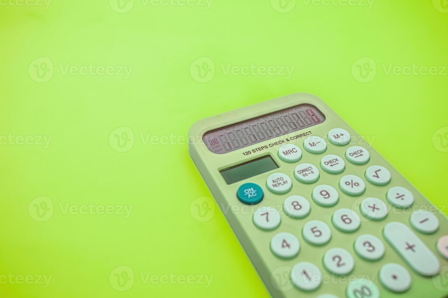 A green calculator with a large display and multiple function buttons is placed on a bright green background Pro Photo