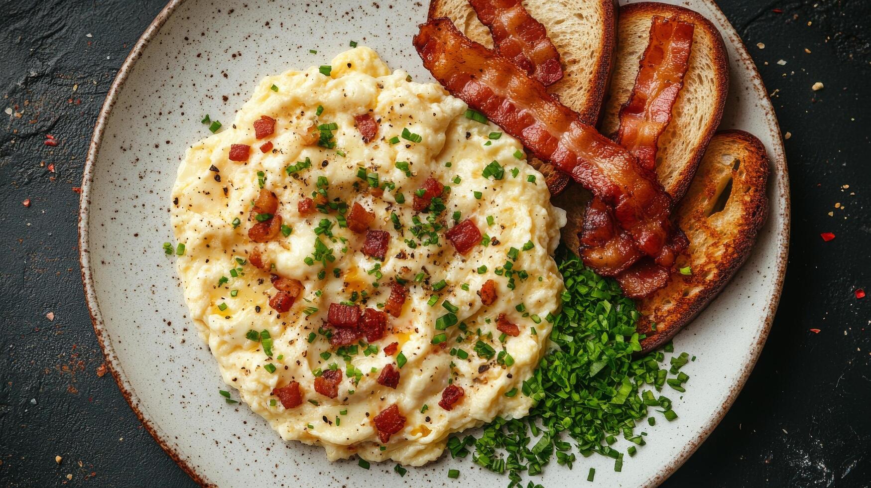 Breakfast featuring creamy mashed potatoes with bacon and toast served on a rustic plate Free Photo