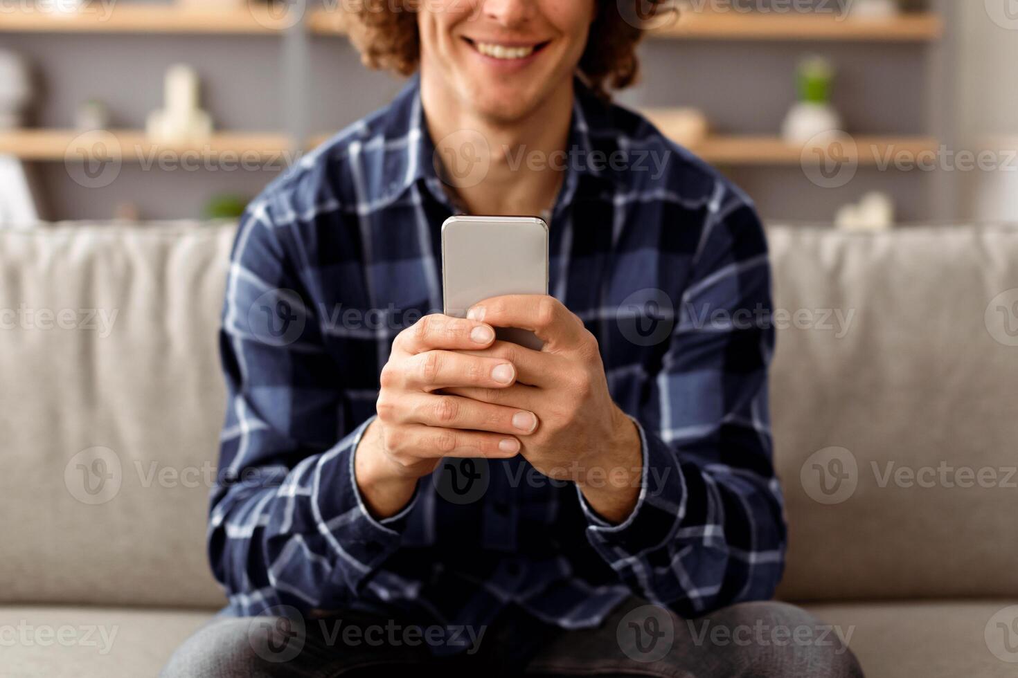 Unrecognizable Hipster Guy Using Mobile Phone Texting And Browsing Internet, Networking In Social Media Online Sitting On Sofa Holding Smartphone At Home. Man With Cellphone Using Application. Cropped Pro Photo