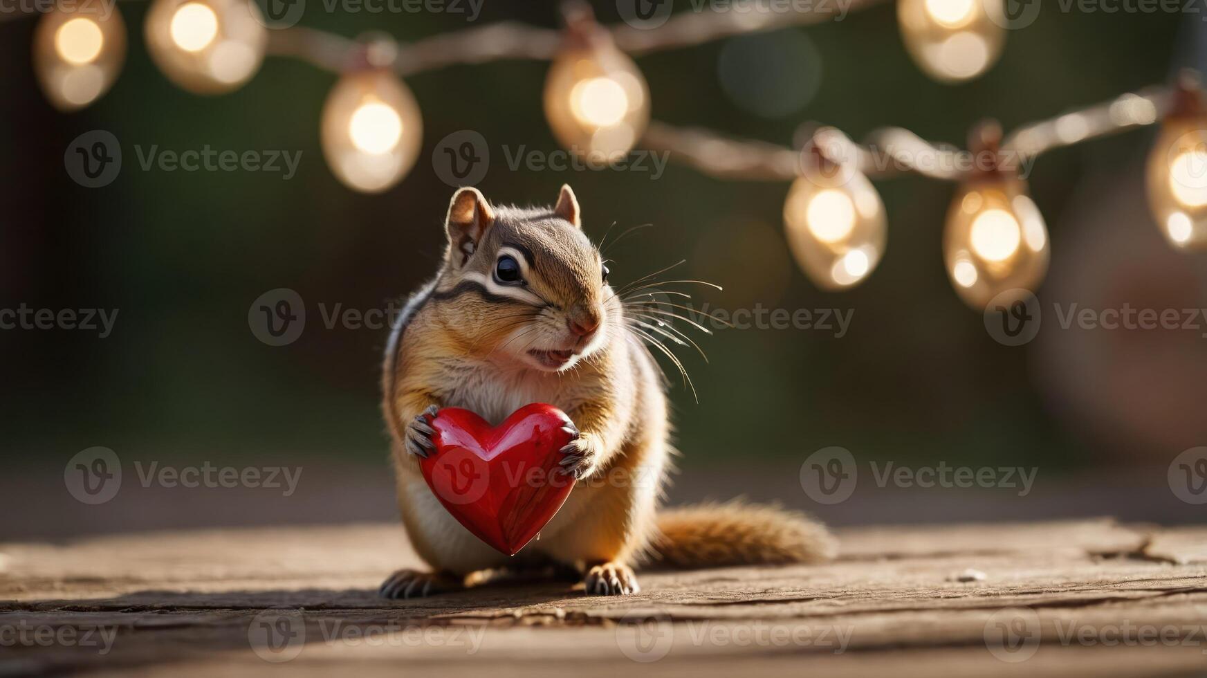 A chipmunk holds a red heart in a warm, festive setting with string lights in the background. Pro Photo