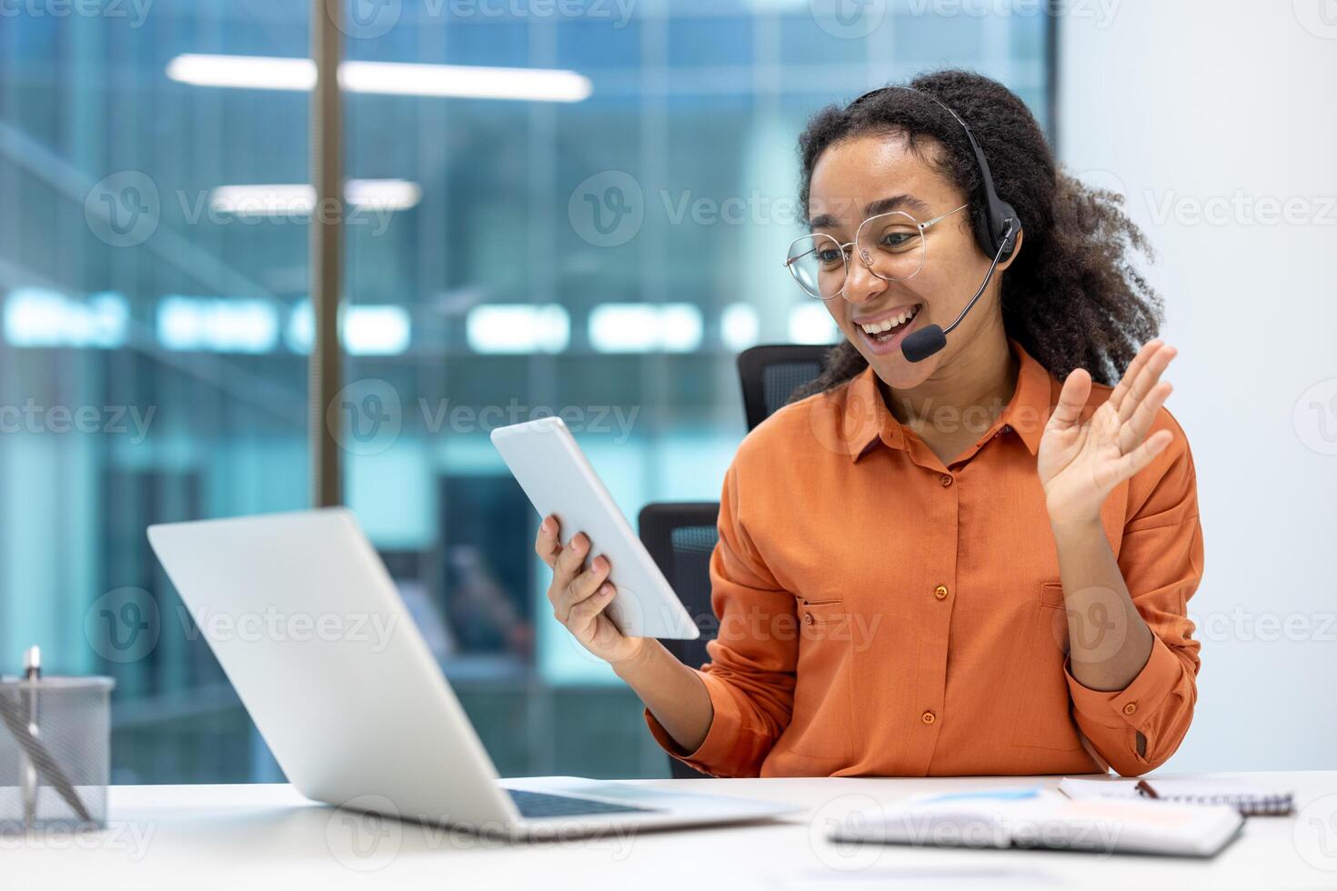 Office worker using smartphone and laptop with headset in modern workspace, engaging in online meeting, multitasking across devices, showcasing professional communication skills and remote work setup Pro Photo