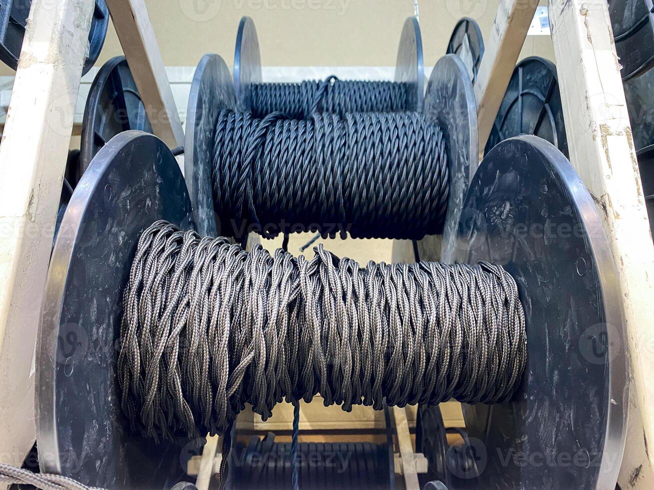 A collection of spools of rope is currently sitting neatly on a rack, waiting to be used for various purposes and applications in different fields such as engineering and manufacturing Pro Photo