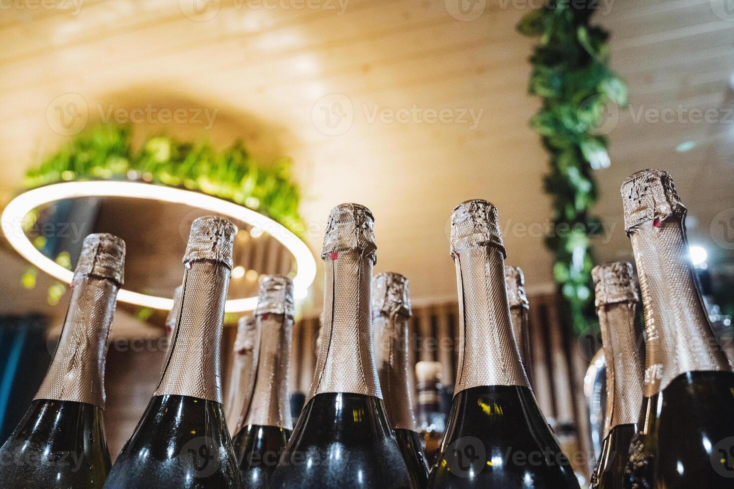 A considerable number of bottles of champagne are carefully stacked one on top of the other on a table, creating a visually appealing display for any occasion or celebration Pro Photo