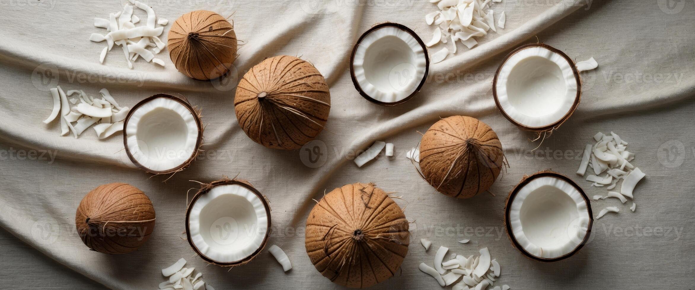 Flat lay of fresh coconuts and shredded coconut on a textured fabric backdropFlat lay of fresh coconuts and shredded coconut on a textured fabric backdrop. Pro Photo