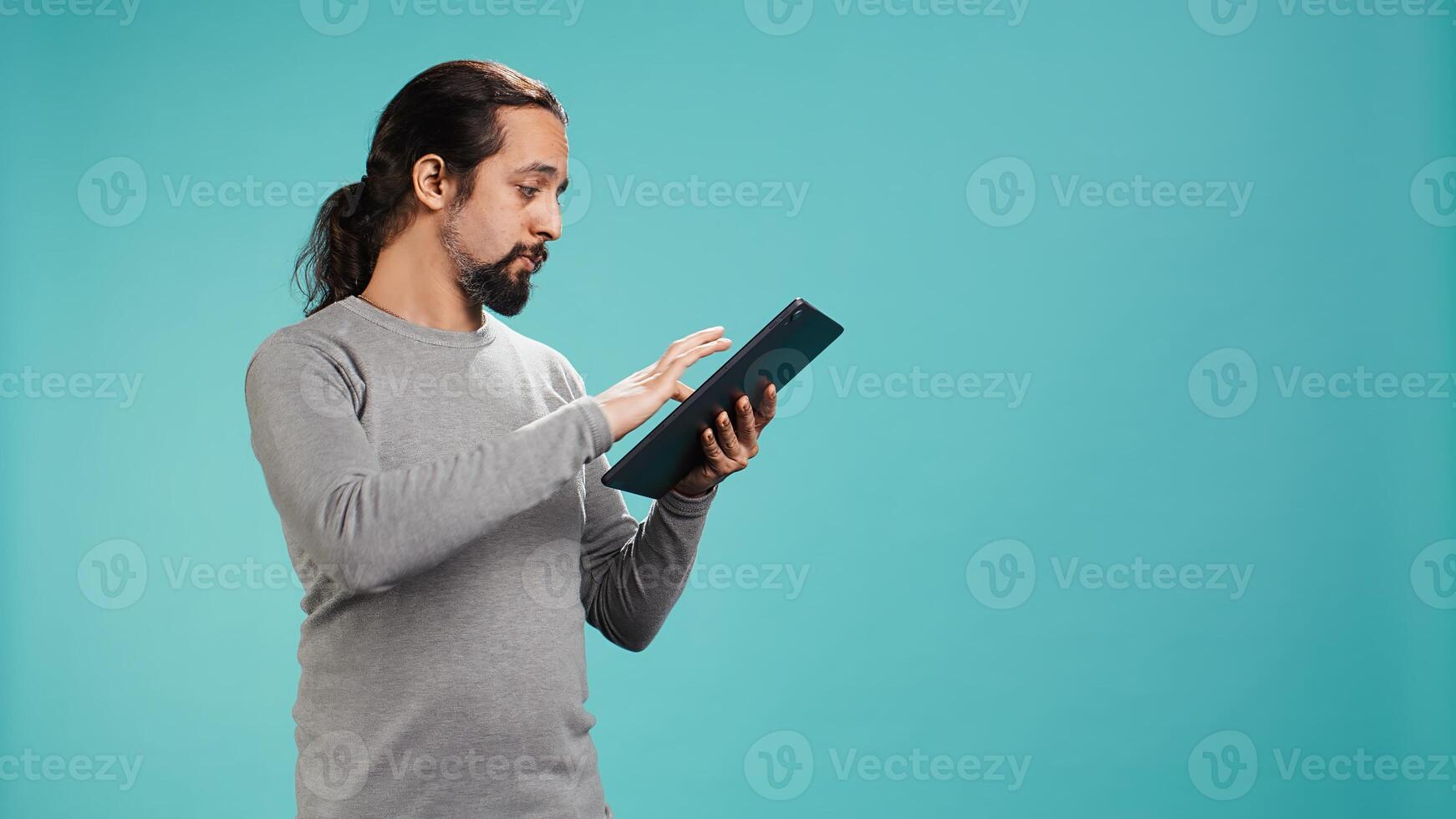 Man browsing though financial audit report on tablet, isolated over blue studio background. Worker reading paperwork on digital portable device, solving business tasks, camera B Pro Photo