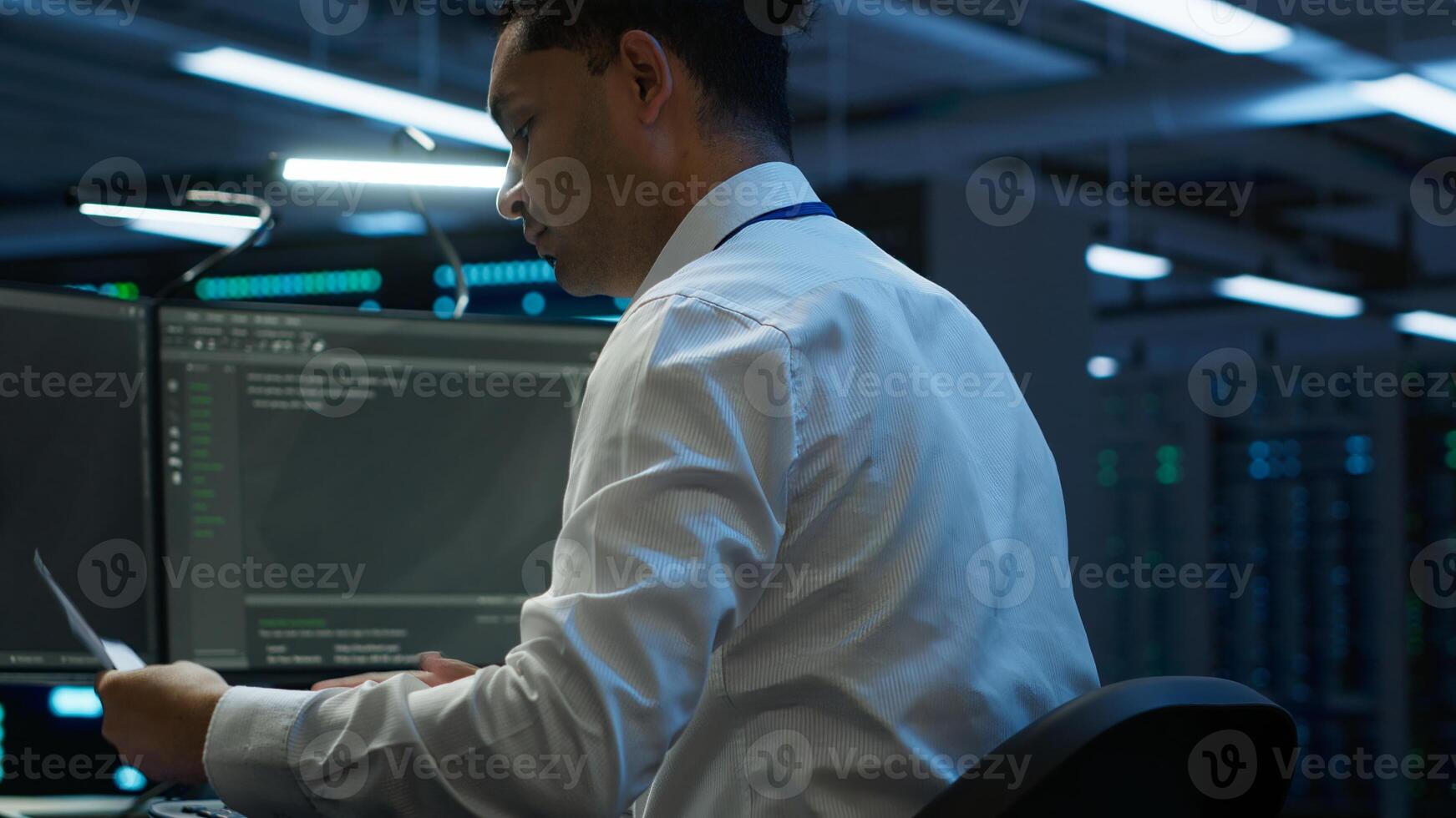 Admin in data center maintaining accurate documentation of infrastructure, configurations and procedures, generating reports. Server room employee doing workspace disaster recovery planning, camera A Pro Photo