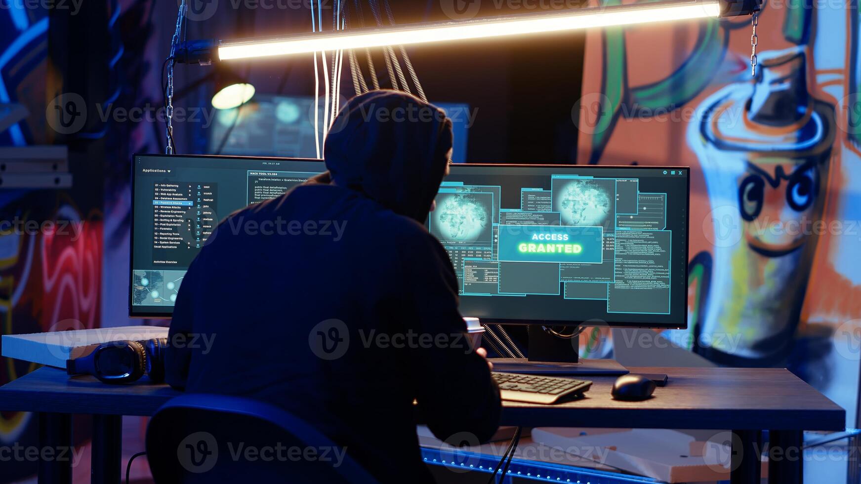 Hacker in hidden shelter excited after managing to launch successful DDoS attack on website, celebrating, crashing it by sending large amounts of traffic from multiple sources, camera B close up Pro Photo