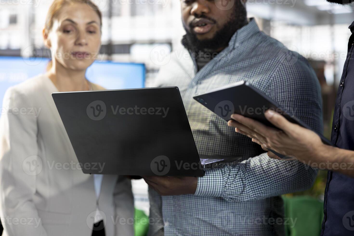 Manager enjoying chat in office, building and maintaining strong relationships with business partners, looking at metrics on laptop. Company director showing shareholders data on notebook Pro Photo